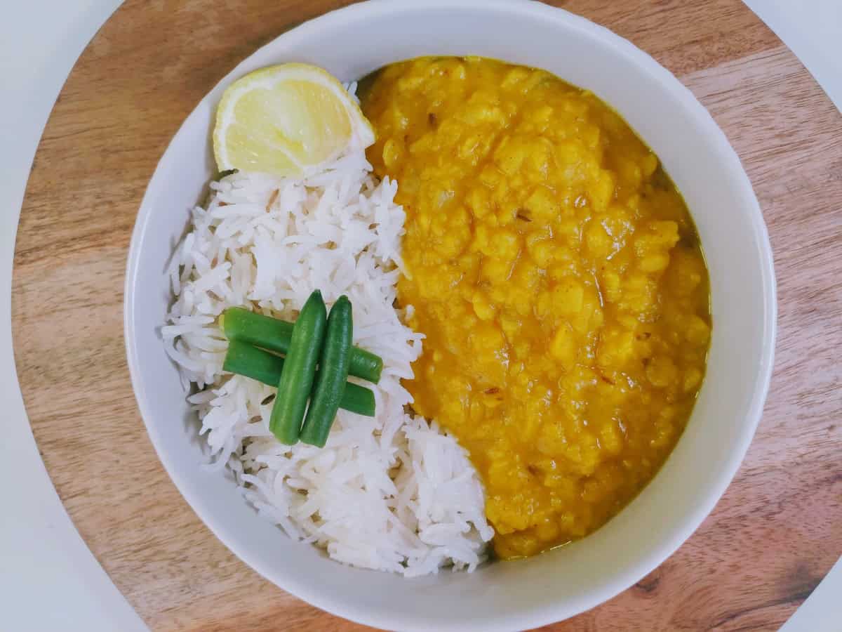 - Put Toor Dahl or dried yellow peas in a pot, cover with water and cook for 30-40 minutes until very soft. Alternatively, you can use a pressure cooker and cook for 10 minutes after the whistle; Set aside.