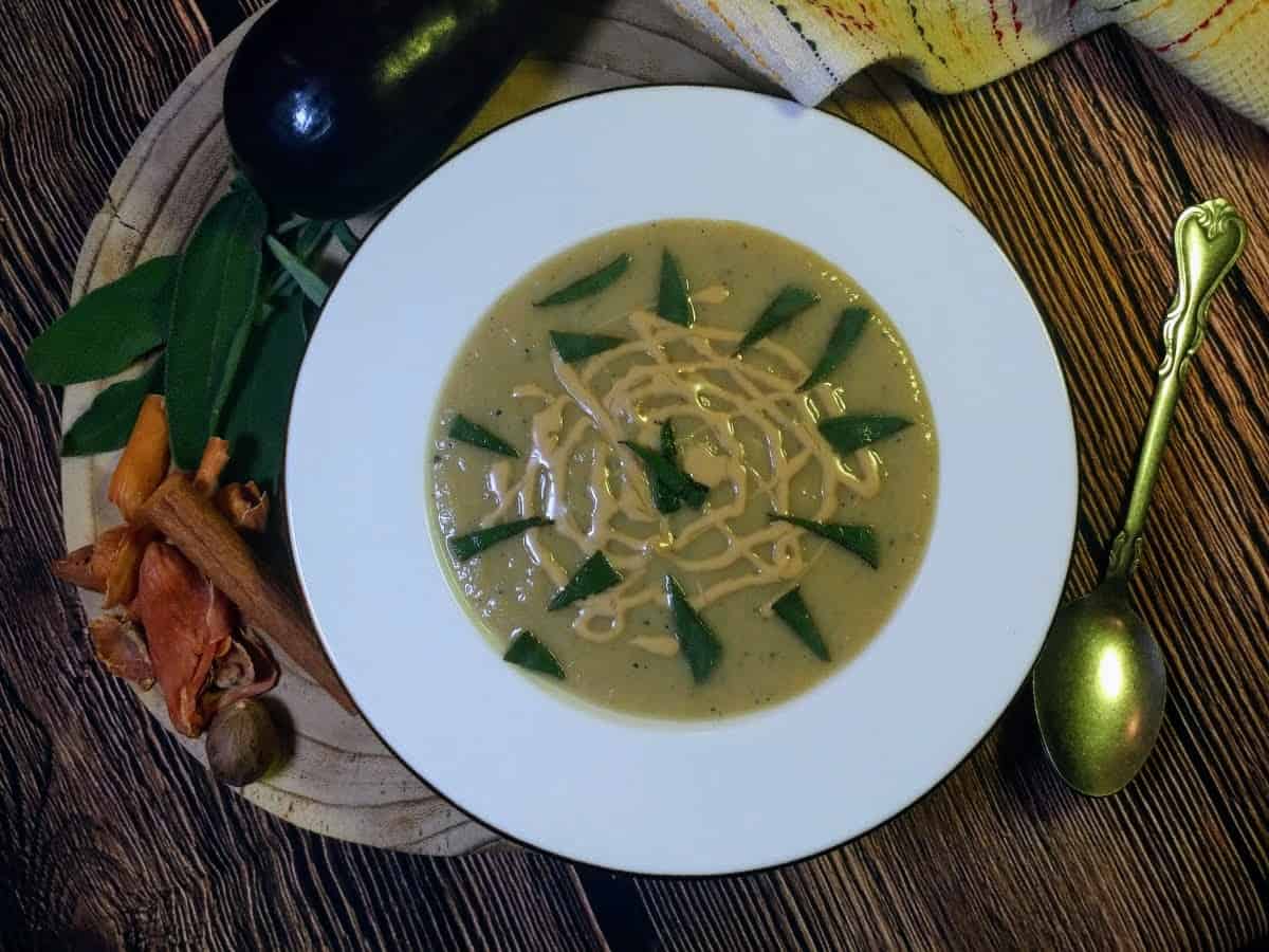 - Pour the soup into bowls, drizzle tahini, sprinkle chopped sage, and serve with croutons or bread.