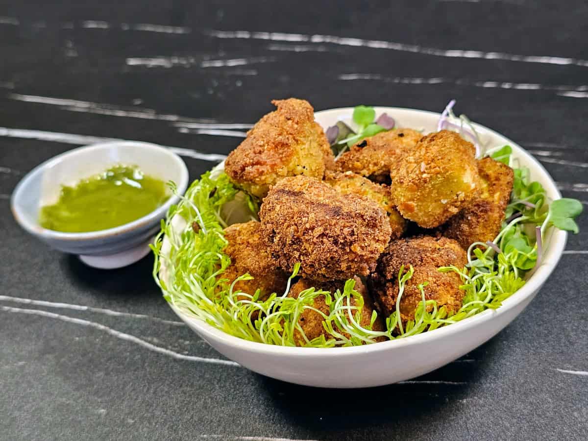 Tip: After dipping the avocado pieces in all three coatings - if there are several bald areas left - dip a silicone brush in the batter, brush the naughty area, and dip again in the bread crumbs.