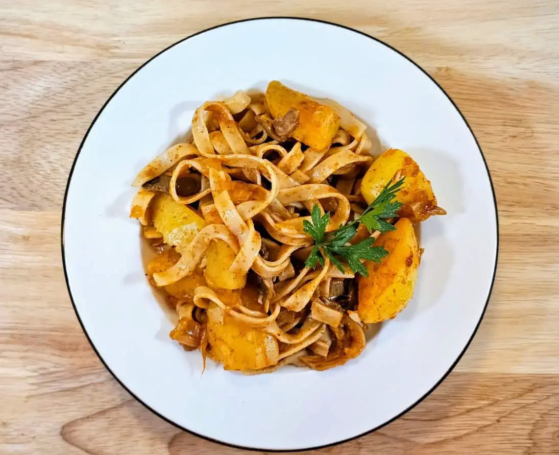 Meanwhile, peel and finely chop the onion. Heat 4 tablespoons of oil in a large skillet or wok and fry the onion until translucent. Add minced garlic, Tear oyster mushrooms into 2 or 3 pieces, and add to onions. Saute them for a few minutes. Remove from the heat and let cool for 2-3 minutes. Mix in paprika, black pepper, and garlic powder.